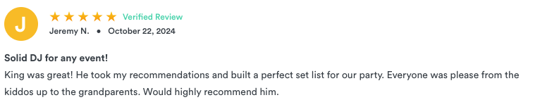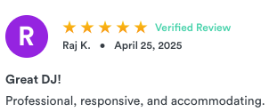 “We researched for months for the Best Entertainment on our Big Day, and King was the most recommended DJ by far. Our guests and family are usually reserved and not big dancers, but he got everybody up and having a ball in no time. He was great at reading the room and getting people to react to the music choices. He has an awesome, smooth voice too! The Turntables & Vinyl Records added so much vibe, looked and sounded great. We whole heartedly recommend King, he really is the best DJ I’ve seen in person, we were blown away. I love this DJ!”