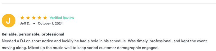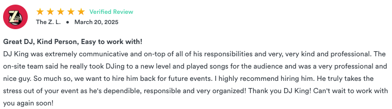 DJ was very polite, accommodating and flexible with his time. I appreciate he took our song requests and was a pleasure to work with. He responded very timely, arrived on time and everyone loved his dj experience and professionalism. Would definitely recommend.